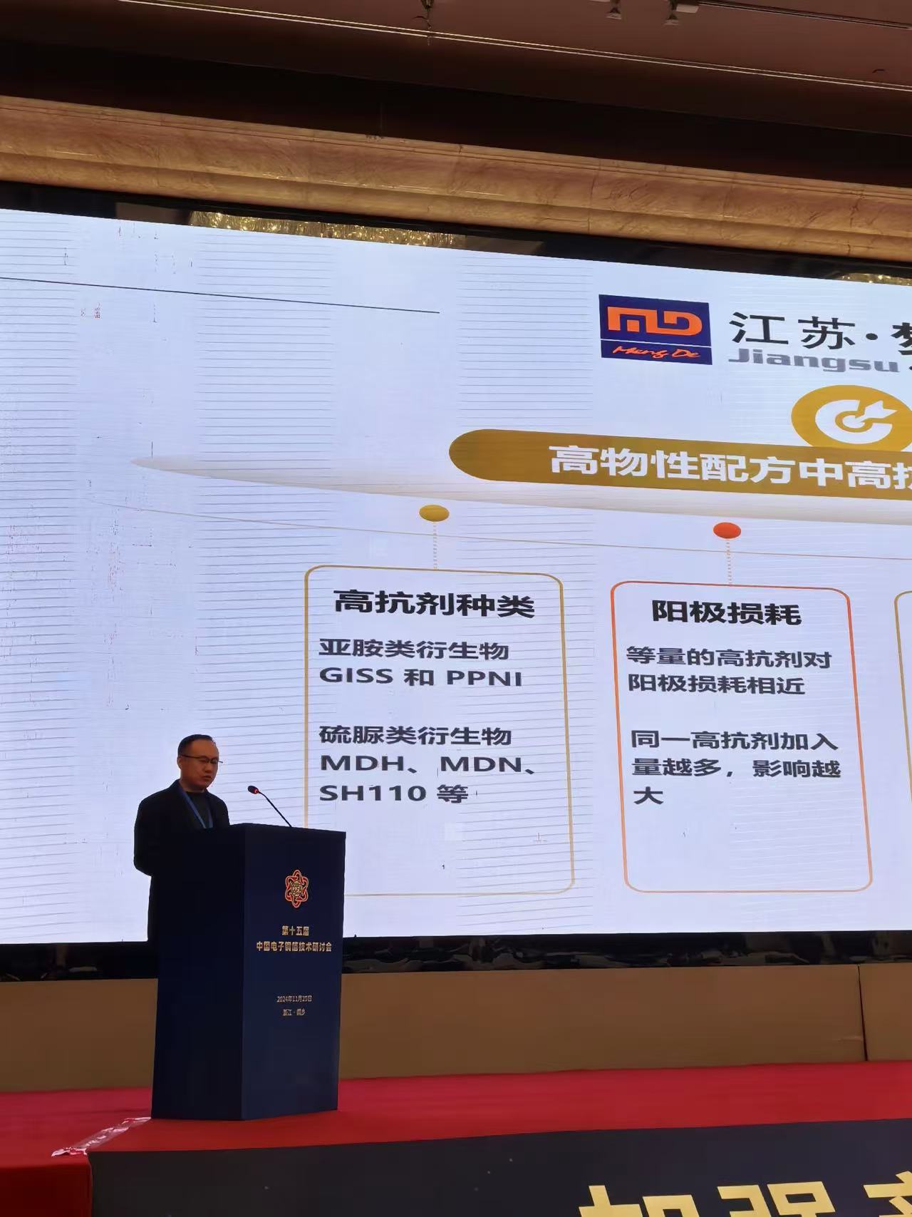 11 月 28 - 29 日,浙江桐鄉迎來瞭(le)電子銅箔行業的年度盛會 —— 由中國電子材料行業協會電子銅箔分會主辦(bàn)的第十五屆電子銅箔技術研讨會。此次研讨會成功吸引瞭(le)國内外 300 餘名企業代表參會,共同聚焦當前銅箔産能過剩、盈利艱難的行業困境,探尋企業通過研發創新與産品結構調整,實現技術突破與産品升級的有效路徑,爲行業的未來發展繪制藍圖。江蘇夢得新材料科技有限公司作爲協會理事單位,由總經理杭康先生、副總經理任彬先生、技術應用研發部部長方輝明先生及營銷團隊代表組成的精英陣容出席瞭(le)本次論壇大會,展現出對行業交流合作的高度重視與積極參與的熱忱。