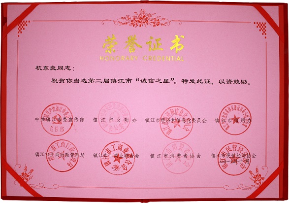 在全市上下認證學習貫徹落實十九大精神之際,由中共鎮江市委宣傳部、鎮江市文明辦、鎮江市經濟和信息化委員會、鎮江市信用辦、鎮江市工商行政管理局、鎮江市工商業聯合會、鎮江市消費者協會、鎮江市民營經濟協會聯合組織開展第二屆鎮江市“誠信之星”、“誠信标兵”評選活動,我公司董事長杭冬良先生榮獲第二屆“誠(chéng)信之星”榮譽稱(chēng)号。