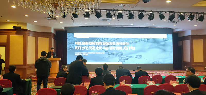 在22日大會期間,公司總經理杭康先生發表主題爲《電解銅箔添加劑研究現狀與發展趨勢》報告,将公司用於锂電銅箔電解中間體原理及性能向大會作瞭(le)很詳細的報告,並(bìng)介紹瞭(le)公司彙編的技術書籍,與會代表對公司高抗拉锂電箔添加劑及多孔銅箔的研發進展以及彙編的技術書籍表現出瞭(le)濃厚的興趣。