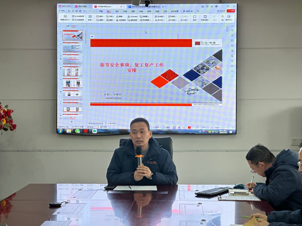 春節的腳步越來越近,團圓的期盼愈發濃厚,但安全責任始終不能有絲毫松懈。爲切實防範春節前後各類安全事故,保障假期生産生活平穩有序,爲節後複工複産築牢安全根基,江蘇夢得新材料科技有限公司於(yú) 2026 年 2 月 10 日下午,在總部三樓會議室隆重召開 2 月份春節安全事項暨複工複産工作安排專題培訓會議,全體員工參(cān)會,共同築牢春節安全防線。
