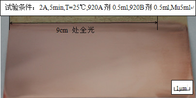 由表3-4可見,920染料型酸銅光亮劑與進口光亮劑的深鍍能力相當。赫爾槽試驗亦可反映出鍍液的深鍍能力。試片正面距近陽極端9cm處(chù)爲全光亮,試片背面有鍍液處(chù)大部分鍍上光亮鍍層(céng)處(chù),可見920染料型光亮劑的深鍍能力相當好。隻要鍍液能夠進入,電流能達到的部位,均能鍍上平整/光亮的銅鍍層(céng)。因此,可以滿足複雜工件鍍銅的特殊質量要求。圖3-5爲添加920光劑所鍍試片。